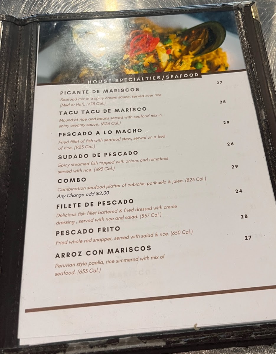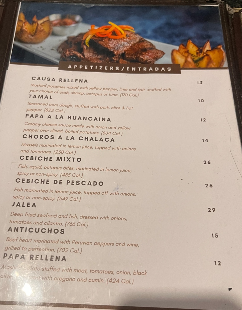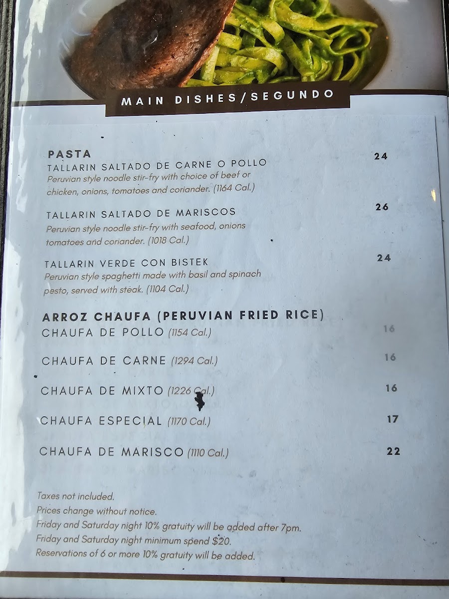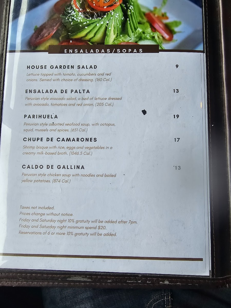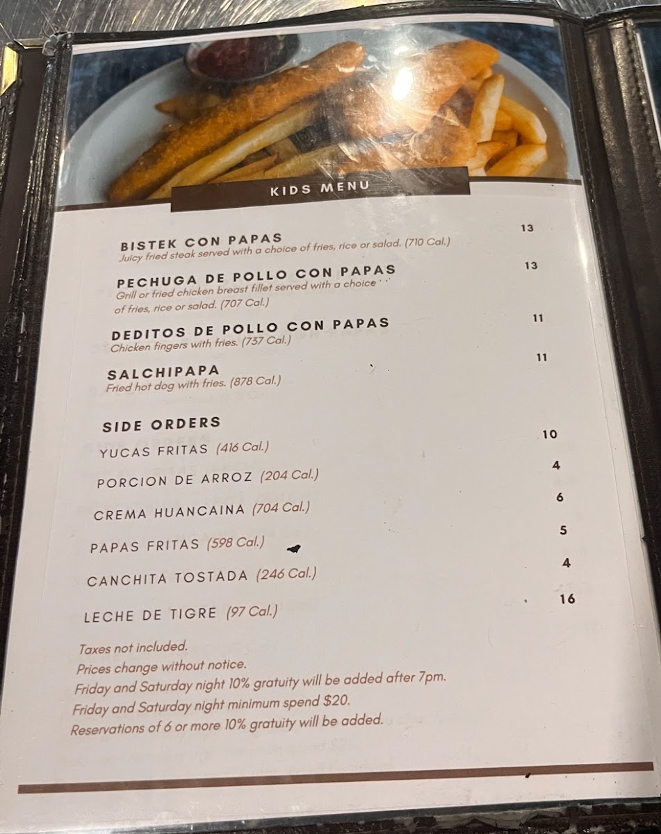 From a reviewer’s perspective, the menu at Aldo’s Restaurant offers a well-rounded selection that highlights traditional Peruvian flavors alongside familiar comfort options. The appetizers, such as Cebiche Mixto, Papa Rellena, Causa Rellena, Papa A La Huancaina, and Anticuchos, provide a strong introduction to the cuisine, while hearty soups like Parihuela and Caldo De Gallina add comforting choices. The main dishes are particularly diverse, featuring flavorful rice dishes like Chaufa Especial De Mariscos, Chaufa De Carne, and Chaufa De Pollo, as well as pasta favorites such as Tallarin Saltado De Mariscos, Tallarin Saltado De Carne O Pollo, and Tallarin Verde (Chicken, Beef, Fillet). Seafood lovers will appreciate house specialties like Picante De Mariscos, Filete De Pescado, Arroz Con Mariscos, and Pescado A Lo Macho, while meat lovers can enjoy Seco Con Frijoles, Bistek A Lo Pobre, and Lomo Saltado. The menu also includes casual options like 1/4 Chicken, 1/2 Chicken, and Whole Chicken from the roastery, plus sides such as Yucas Fritas, French Fries, Crema Huancaina, and Porcion De Arroz (Rice Portion). To finish, desserts like Dulce Tres Leches, Crema Volteada, and Alfajores provide a sweet ending, complemented by a wide selection of drinks including Pisco Sour, Chilcano, Whiskey Sour, Vodka & Tonic, Chicha Morada, Perrier, Ginger Ale, House Wine, and Sangria 1 Liter. Overall, the menu reflects a satisfying mix of traditional Peruvian specialties, seafood, meat dishes, and classic beverages, making it a solid choice for diners looking to explore rich flavors and varied options in one place.