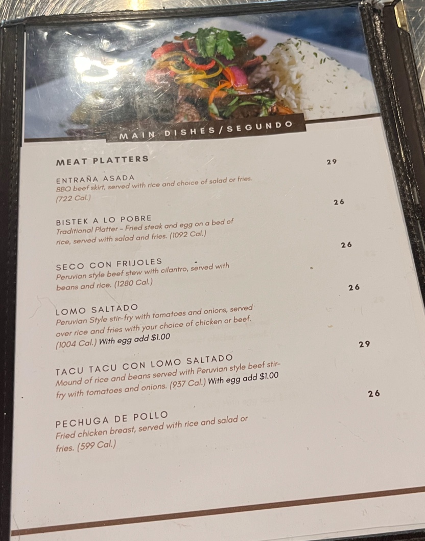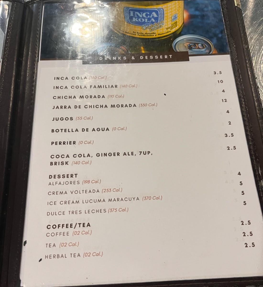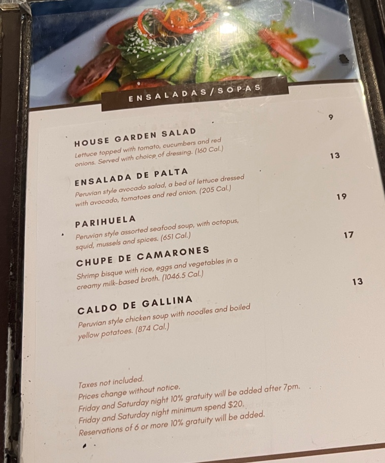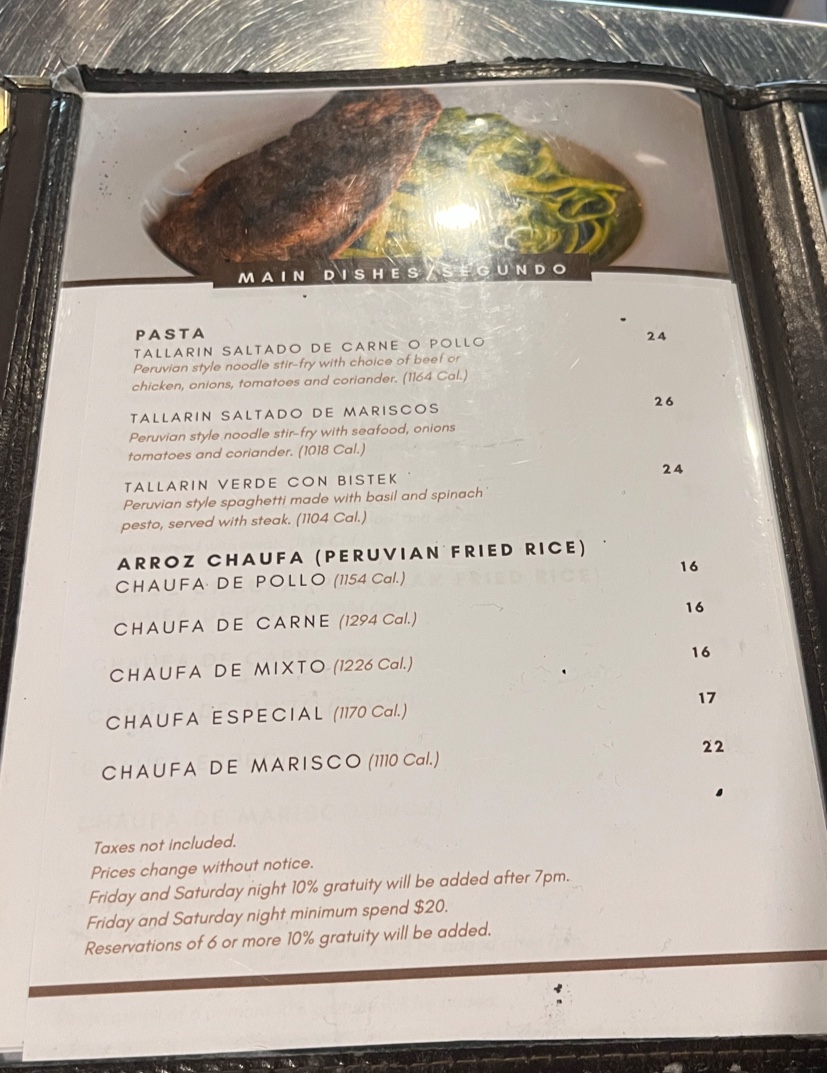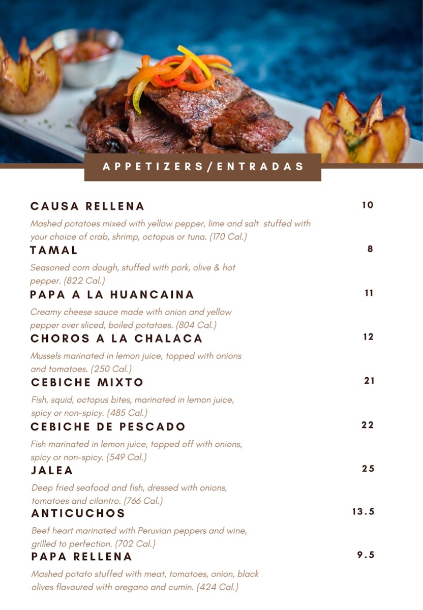 From a reviewer’s perspective, the menu at Aldo’s Restaurant offers a well-rounded selection that highlights traditional Peruvian flavors alongside familiar comfort options. The appetizers, such as Cebiche Mixto, Papa Rellena, Causa Rellena, Papa A La Huancaina, and Anticuchos, provide a strong introduction to the cuisine, while hearty soups like Parihuela and Caldo De Gallina add comforting choices. The main dishes are particularly diverse, featuring flavorful rice dishes like Chaufa Especial De Mariscos, Chaufa De Carne, and Chaufa De Pollo, as well as pasta favorites such as Tallarin Saltado De Mariscos, Tallarin Saltado De Carne O Pollo, and Tallarin Verde (Chicken, Beef, Fillet). Seafood lovers will appreciate house specialties like Picante De Mariscos, Filete De Pescado, Arroz Con Mariscos, and Pescado A Lo Macho, while meat lovers can enjoy Seco Con Frijoles, Bistek A Lo Pobre, and Lomo Saltado. The menu also includes casual options like 1/4 Chicken, 1/2 Chicken, and Whole Chicken from the roastery, plus sides such as Yucas Fritas, French Fries, Crema Huancaina, and Porcion De Arroz (Rice Portion). To finish, desserts like Dulce Tres Leches, Crema Volteada, and Alfajores provide a sweet ending, complemented by a wide selection of drinks including Pisco Sour, Chilcano, Whiskey Sour, Vodka & Tonic, Chicha Morada, Perrier, Ginger Ale, House Wine, and Sangria 1 Liter. Overall, the menu reflects a satisfying mix of traditional Peruvian specialties, seafood, meat dishes, and classic beverages, making it a solid choice for diners looking to explore rich flavors and varied options in one place.